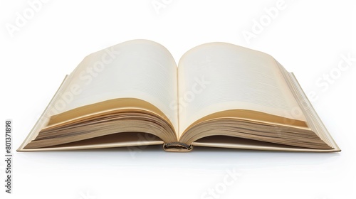 Mockup of an open book with blank pages, isolated on a white background, shown from a top view perspective. 3D illustration