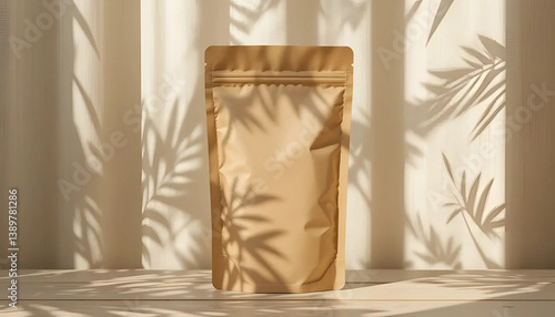 Mockup of brown kraft paper tea pouch on light wooden surface, soft natural sunlight casts artistic shadows of palm leaves, beige background, perfect for your brand or design