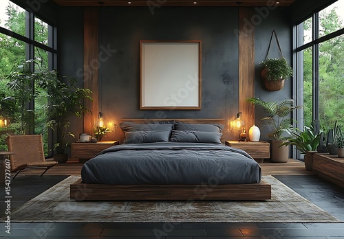Mockup of modern bedroom with dark bed wooden decor and blank frame