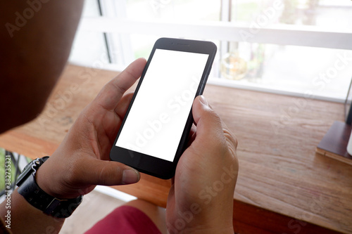 Mockup picture of business woman’s hands/man's hands holding smart phone with white blank screen in modern place.