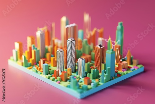 Model City on Pink Background, A 3D graph of investment values in different industries, AI Generated