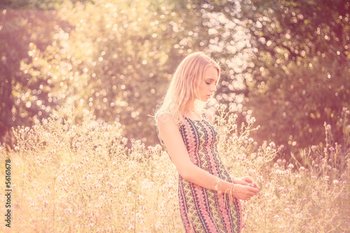Model girl on the Field in Sun Light. Long Hair