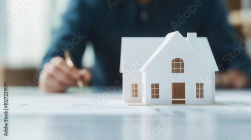 Model house on desk with person planning architecture or real estate project, symbolizing home design and construction.