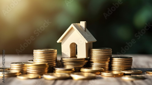 model of house with coins, savings or house mortgage concept