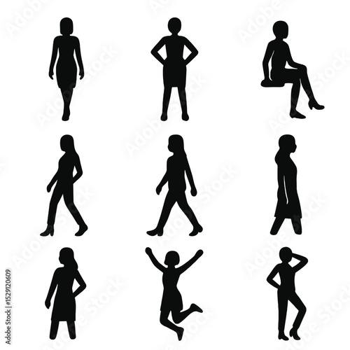 Model Pose Icons. Flat icon set of model poses: runway walk, hands on hips, seated pose, leaning pose, walking silhouette, profile
