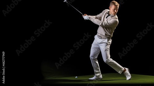 Model showcasing a golfer's swing stance, emphasizing form and technique, set on a golf course