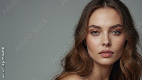 Model with long wavy hair poses elegantly against a muted backdrop, showcasing natural beauty and a calm expression in a simple studio setting