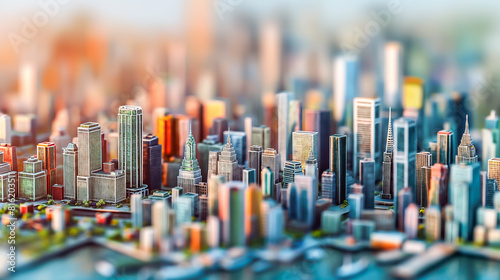 Modeled as a 3D cityscape where each building represents a different store, Futuristic skyline, Colorful cityscape, Mini building model
