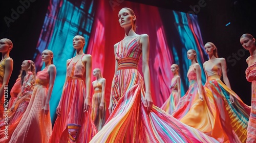 Models showcase stunning multicolored gowns on a vibrant fashion show runway, highlighting creativity and elegance in modern couture design.