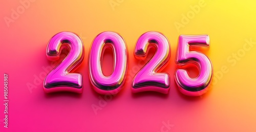 Modern 3D "2025" Text in Shiny Pink Chrome on a Vibrant Red and Yellow Gradient Background