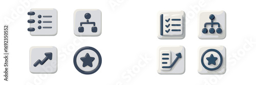 Modern 3D icon set for business, project management, and web design, featuring checklist, flowchart, growth graph, and star symbols
