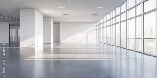 Modern 3D Rendered Empty Office Interior with Sunlit Floor-to-Ceiling Windows and Minimalistic Design, Perfect for Creative and Professional Workspaces