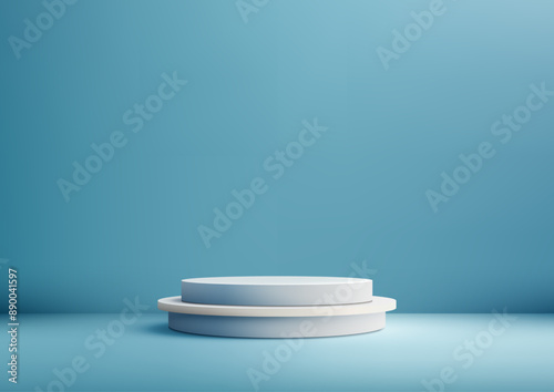 Modern 3D White Circles Podium on Blue Background, Minimal Style Product Display, Mockup, and Showcase