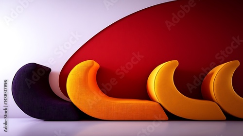 Modern abstract furniture design featuring colorful curved sofas against a vibrant wall