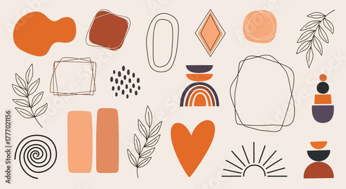 Modern abstract organic shapes and bohemian style graphic design elements collection in warm earthy tones, perfect for creative projects and contemporary aesthetics