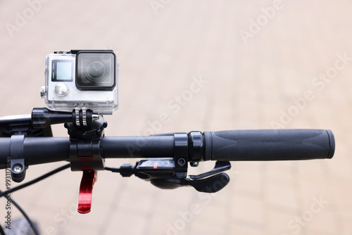 Modern action camera with mount on bicycle outdoors, closeup