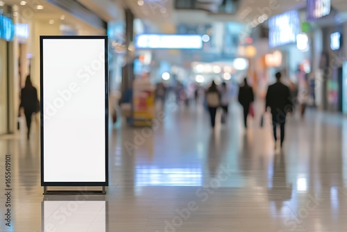 Modern Advertisement Billboard Display on Mall Floor with Blurred People Background Creating a Captivating Scene