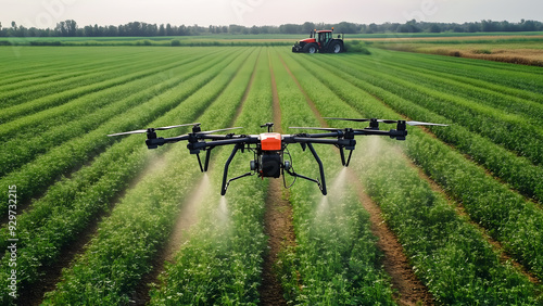 Modern Agricultural drone flying over a green field and sprays pesticides to destroys harmful insects and increase productivity.