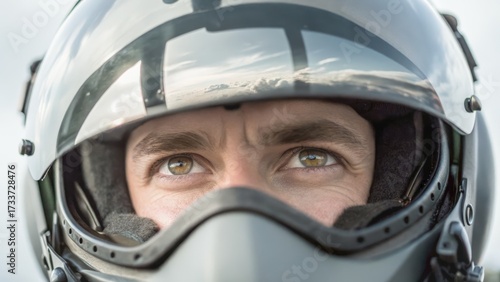 modern air combat uk Intense gaze of a pilot in a helmet, reflecting focus and determination against a blurred background.