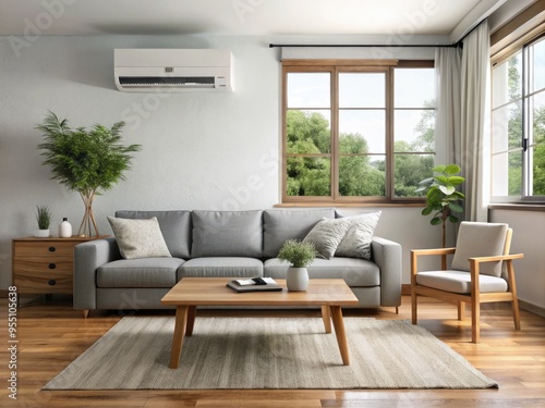 Modern air conditioning unit mounted on a white wall in a cozy living room with plush couch, wooden coffee table, and large windows.