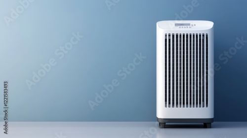 Modern Air Purifier on a Minimalist Table Against a Soft Blue Wall for Clean Indoor Air Quality Improvement
