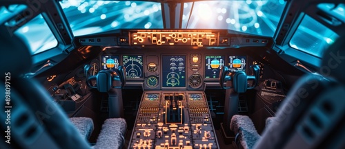 Modern airplane cockpit at night with illuminated control panel and navigation instruments. Concept of aviation, travel, technology, and transportation.