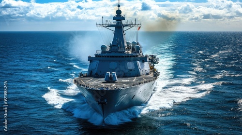 Modern American warship on patrol, showcasing its advanced technology and dominance on the high seas.
