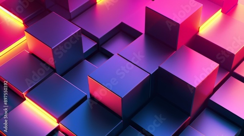 Modern and abstract composition with metallic cubes background and purple and pink neon lights