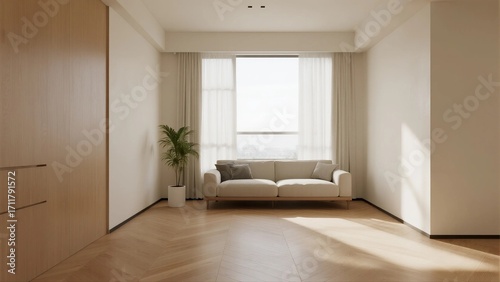Modern and bright living room with sofa and large window