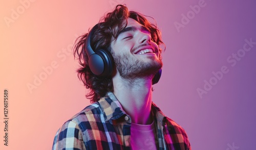 Modern and cool man listening music on headphones with smiley and happy attitude on trendy color background