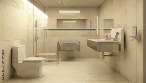 Modern and Elegant Bathroom Interior Design Featuring Toilets, Showers, Sink, and Accessible Facilities with Neutral Color Palette and Contemporary Finishes