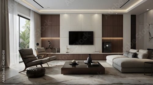 modern and minimal living room interior design, TV wall design, contemporary interior design, 3D render, cinematic lighting