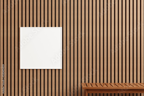 Modern and minimalist square white poster or photo frame mockup on the outdoor wooden wall. 3d rendering.
