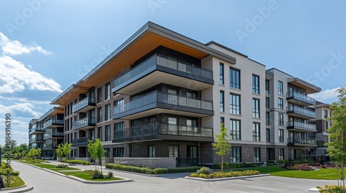 Modern Apartment Building with Balconies and Landscaped Grounds
