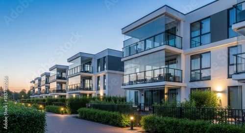 Modern Apartment Buildings with Glass Balconies at Dusk