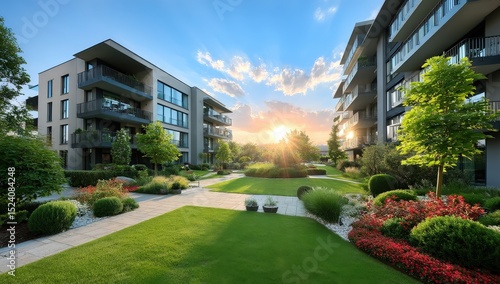 Modern apartment buildings with landscaped gardens and bright sunlight at sunset.