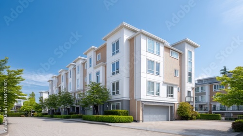 Modern Apartment Complex Surrounded by Lush Greenery Under Clear Blue Sky
