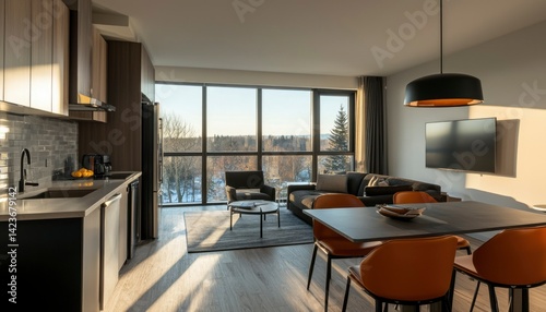 Modern apartment interior, sunny view
