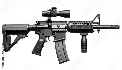 Modern AR-15 style assault rifle with scope, foregrip, and telescoping stock on neutral background.