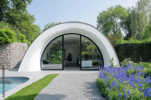 Modern architectural design featuring a curved white structure surrounded by lush greenery and blooming flowers by a tranquil pool area in a bright sunny environment