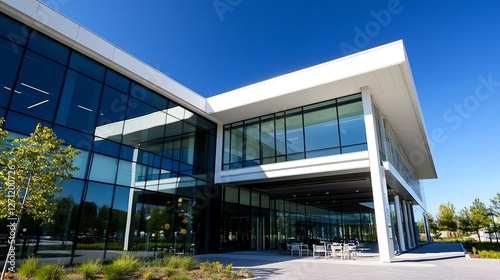 Modern architectural design featuring a glass facade and sleek outdoor area : Generative AI