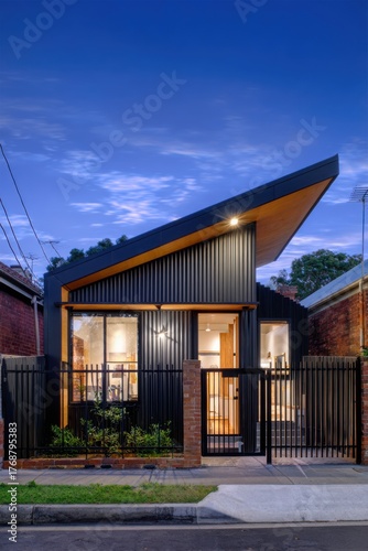 Modern architectural design of a stylish house featuring a unique roof and vibrant landscaping during twilight in an urban setting