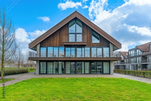 Modern architectural design of a wooden house surrounded by greenery under a bright blue sky in a peaceful neighborhood setting