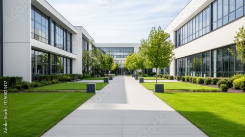 Modern Architectural Design of Office Buildings Surrounded by Lush Greenery in a Sunny Urban Environment
