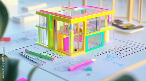 Modern Architectural Design: Vibrant 3D Model of a Colorful House on Blueprint