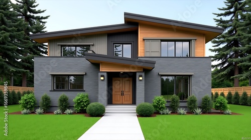 Modern architectural home with clean lines and natural wood accents surrounded by lush greenery and tall evergreen trees on a sunny day