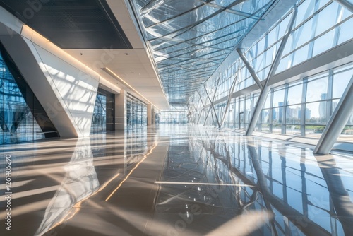Modern architectural interior featuring expansive glass windows and reflective floors in a city location