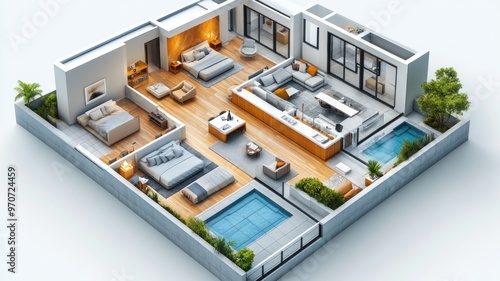 Modern architectural layout with living spaces and pools.