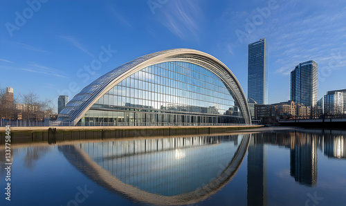 Modern architectural marvel with curved glass facade reflecting in calm waters, surrounded by urban skyline