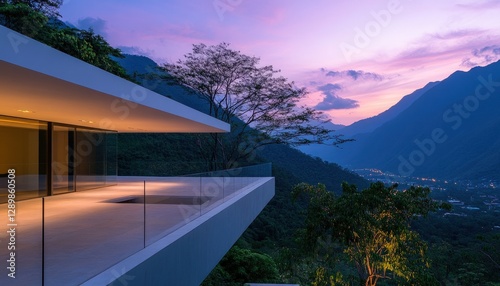 Modern Architectural Terrace Overlooking Mountain Landscape During Twilight
